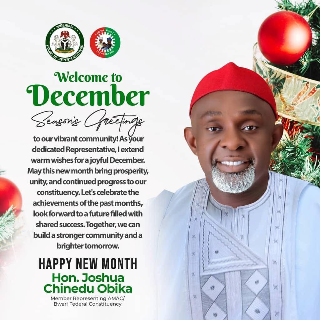 Season’s greetings to everyone and to the amiable and hospitable people of AMAC/Bwari Federal Constituency. I sincerely appreciate your unwavering support and prayers. We thank the Almighty God for His guidance and for bringing us into the last month of the year.